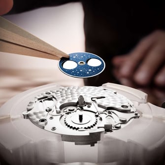 Complementando las estilizadas líneas de la caja, el diseño de la esfera es un ejercicio de simetría y equilibrio exquisito. El indicador combinado de fases lunares y fecha aporta una marcada identidad visual a este modelo: una luna plateada destaca sobre un fondo azul intenso decorado con estrellas y, alrededor de la ventanilla de las fases lunares, las fechas se han impreso por transferencia en color negro sobre el fondo color terracota de la esfera.