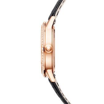 D’une sophistication sans faille et disponible en 29 mm ou 34 mm, elle présente une silhouette élégante. Le fond en verre saphir dévoile les mouvements de son calibre automatique, entièrement développé, fabriqué et assemblé dans nos ateliers de la Vallée de Joux. Dotés d’un indicateur du jour et de la nuit ou des phases de lune, les chiffres et les aiguilles floraux adoptent une silhouette contemporaine élancée, qui leur confère une apparence élégante et moderne. Le décor guilloché et la finition en nacre sertis de diamants reflètent les plus belles traditions de la Haute Horlogerie.