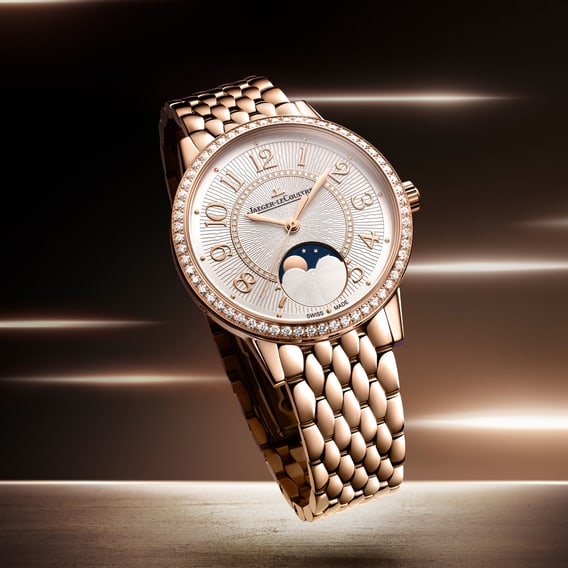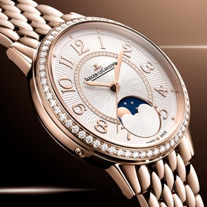 Grain-set with 107 diamonds on the bezel and dial, the Rendez-Vous Moon radiates a luminous jewellery spirit. Matching the inner ring, the textured guilloché dial is enhanced by golden cabochon hour markers and floral numerals, gracefully framing the moon-phase at 6 o’clock.