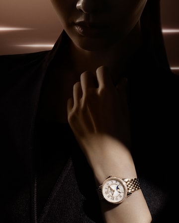 As the Rendez-vous Moon begins to run, the moon disc advances smoothly beneath its aperture, offering a clear and steady reading of each lunar phase. The display reveals the depth and fine detailing that define the complication, highlighting the graceful rhythm of its mechanical progression. Completing the timepiece, the lozenge-shaped second-skin bracelet moves fluidly with each gesture.