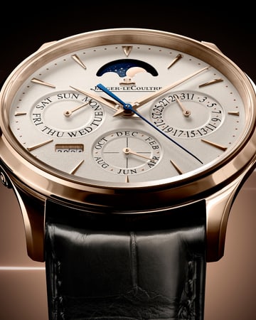 The perpetual calendar’s four displays begin their cycle – day, date, month and year appearing in flawless harmony. The moon-phase at 12 o’clock settles into motion, revealing the balanced architecture of the dial. The pink gold case enhances each indication as it comes alive, expressing the refined clarity that defines the Master Ultra Thin Perpetual Calendar.