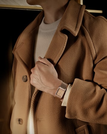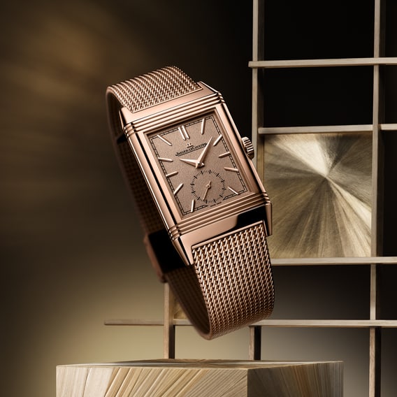 Exuding vintage glamour and confident modernity, the Reverso Tribute ‘Or Deco’ features a 18K (750/1000) gold Milanese link bracelet, paired with a pink gold case and a golden grained dial that perfectly matches the precious metal’s colour. This model embodies an eloquent expression of the Reverso’s stylistic evolution.