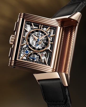 The Reverso Tribute Chronograph is a marvel of precision. The open-worked dial reveals the intricate Manufacture Calibre 860, including a chronograph redesigned for the iconic rectangular case. With a 52-hour power reserve, this timepiece elegantly marries tradition and modernity. The sunray black dial, adorned with applied indexes and Dauphine hands, contrasts beautifully with the gold case. Embodying the Reverso spirit, it offers versatility with two interchangeable Casa Fagliano straps.
