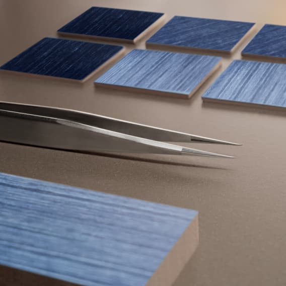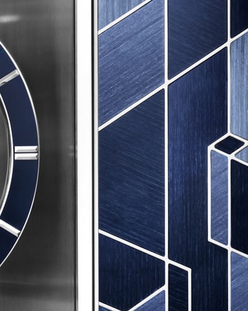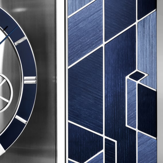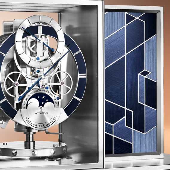 Atmos空气钟机械装置悬浮于玻璃罩中央,呈现近乎无重的视觉效果。整体巧妙融入多种润饰工艺:拉丝表面呼应细木镶嵌的纹理,蓝色漆面与表盘时标相映成趣,强化整体的色彩平衡。小时钟盘饰以天蓝色润饰工艺,丰富纹理质感,令材质、色彩和机械装置浑然一体、妙趣横生。