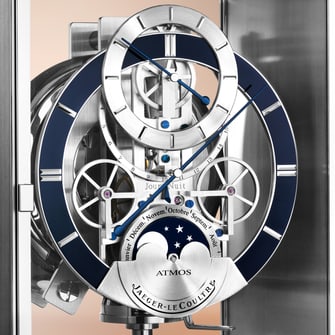 Atmos空气钟无需手动上链,也无需外接能源,仅依靠微小的环境温度变化获得运行驱动力。内部的密封气囊随着温度变化而膨胀和收缩,并把动能高效传导至发条,积蓄运行能量。仅一摄氏度的温度变化就能提供近48小时的运行动力。6000万台空气钟的耗能总和,与一枚15瓦灯泡相当,能耗之低令人叹为观止。