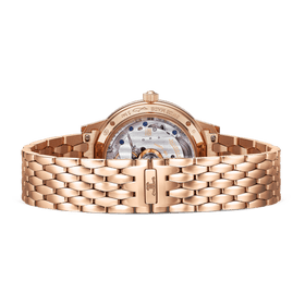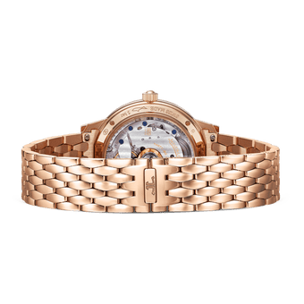 Rendez-Vous约会系列于2012年首次亮相,外观风格与复杂内芯相辅相成,作为开创性时计杰作载誉等身。纹理感玑镂饰纹、凸圆形时标、镶钻内圈、花体数字和指针——繁复精致的表盘装饰搭配精美月相复杂功能,更显迷人魅力。融合高级珠宝工艺与高级制表复杂功能,匠心诠释璀璨优雅与机械美感。